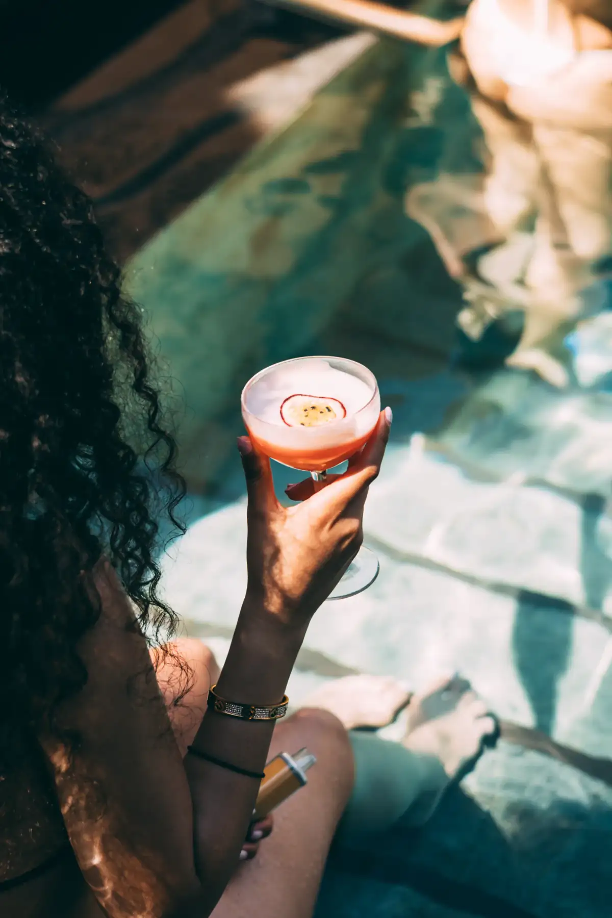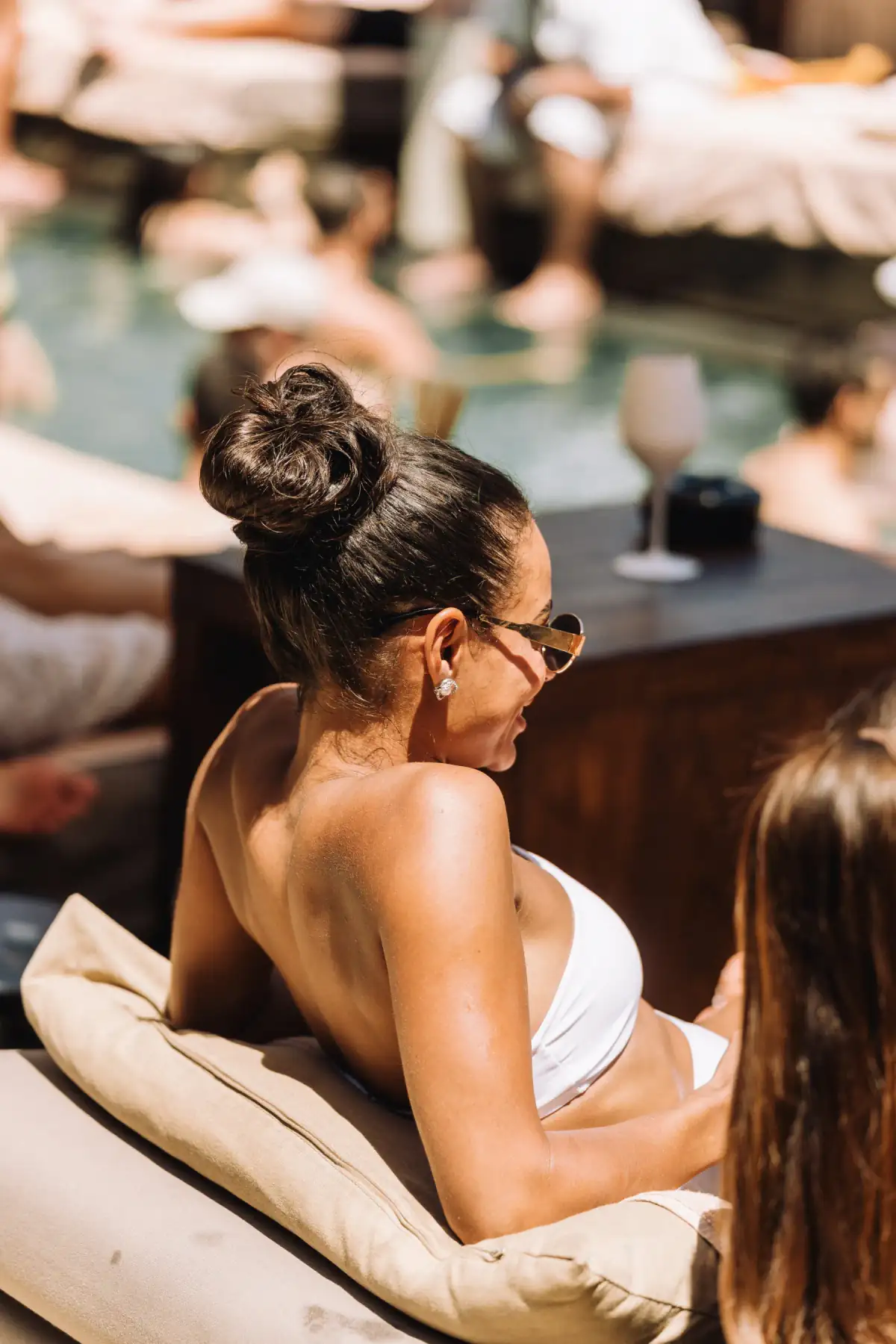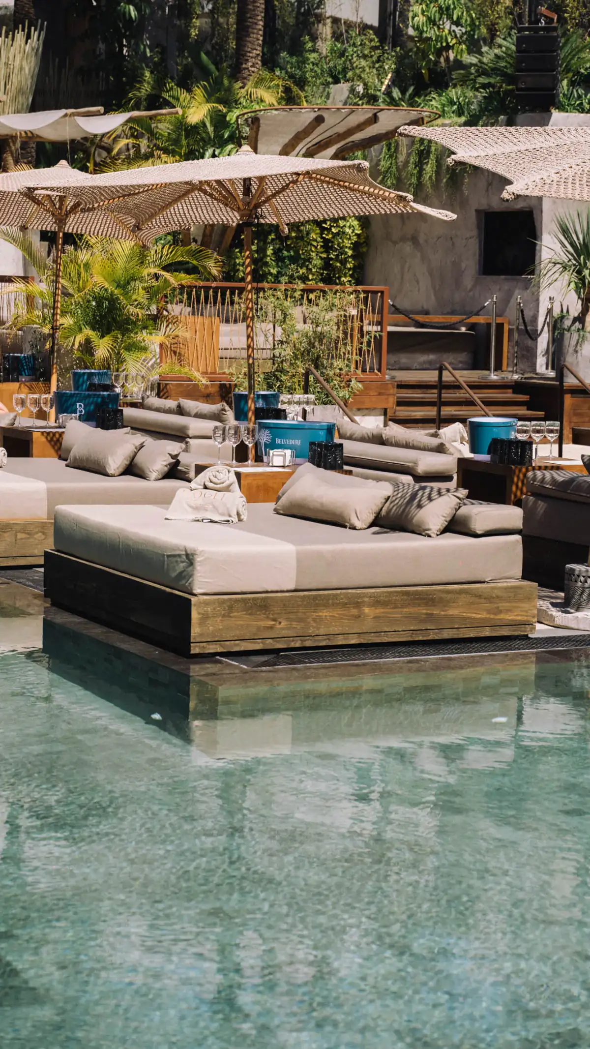 De zwembadzone is het echte hart van het concept: hier komen muziek, sfeer, styling en service samen in een setting die overdag al veel energie heeft en later nog exclusiever aanvoelt.